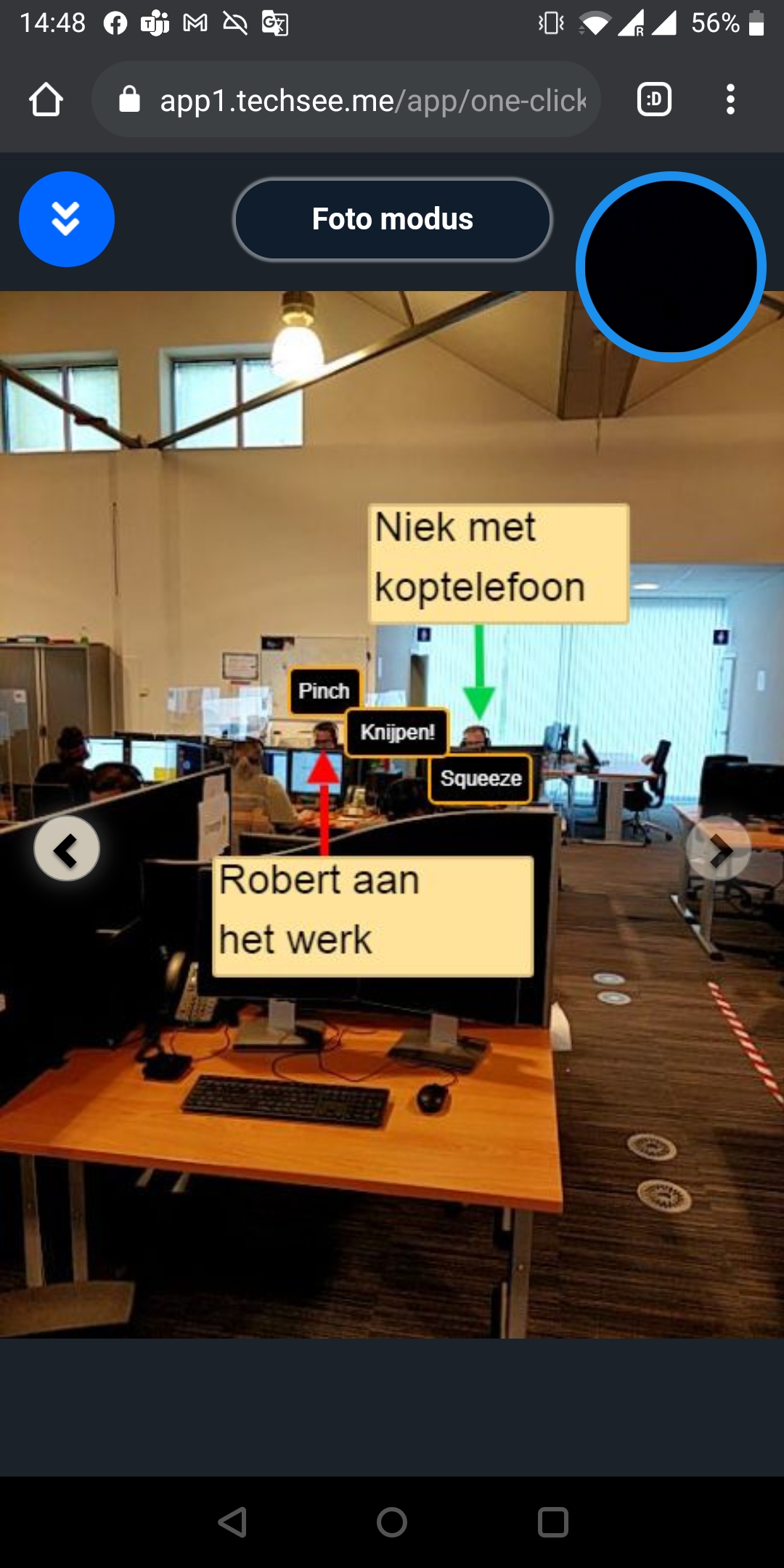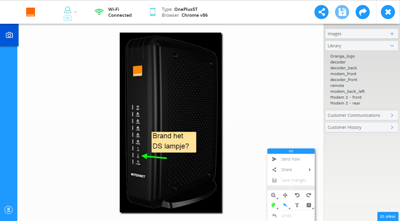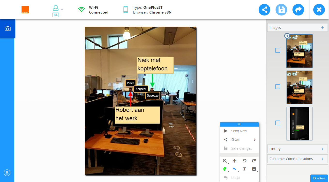 De foto's die de klant heeft gemaakt verschijnen zo goed als onmiddelijk bij ons het het scherm. Aan de hand van de beelden kunnen we de klant mondelinge instructies geven, maar we kunnen ook visuele instructies aan de foto's toevoegen en deze weer terugsturen naar de klant.