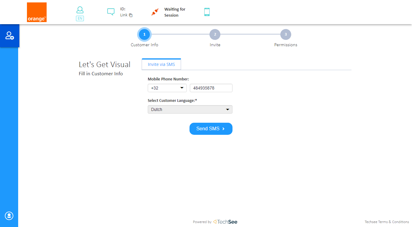 Eens je ingelogd bent kun je de klant via sms uitnodigen om TechSee te gebruiken. Vul simpelweg het gsm-nummer in, selecteer de taal van de klant (Engels, Nederlands of Frans) en verstuur de sms.