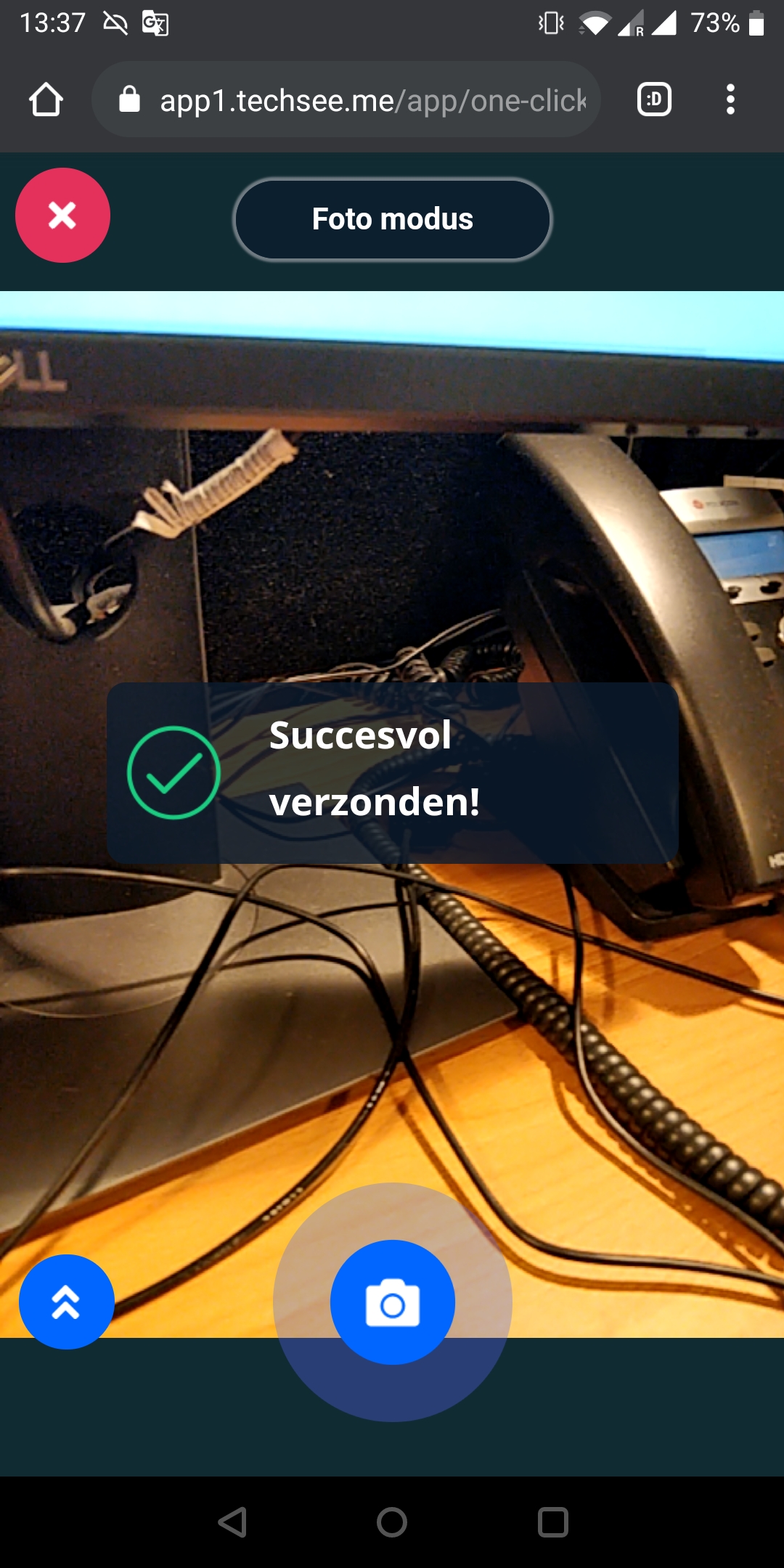| De klant kan vervolgens simpelweg de camera op het onderwerp richten waar foto's van nodig zijn en op het camera-icoon klikken. | De klant krijgt een melding dat de foto succesvol is verzonden. |