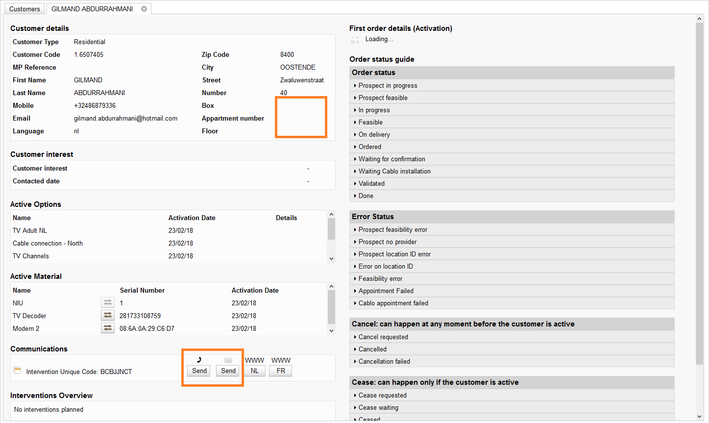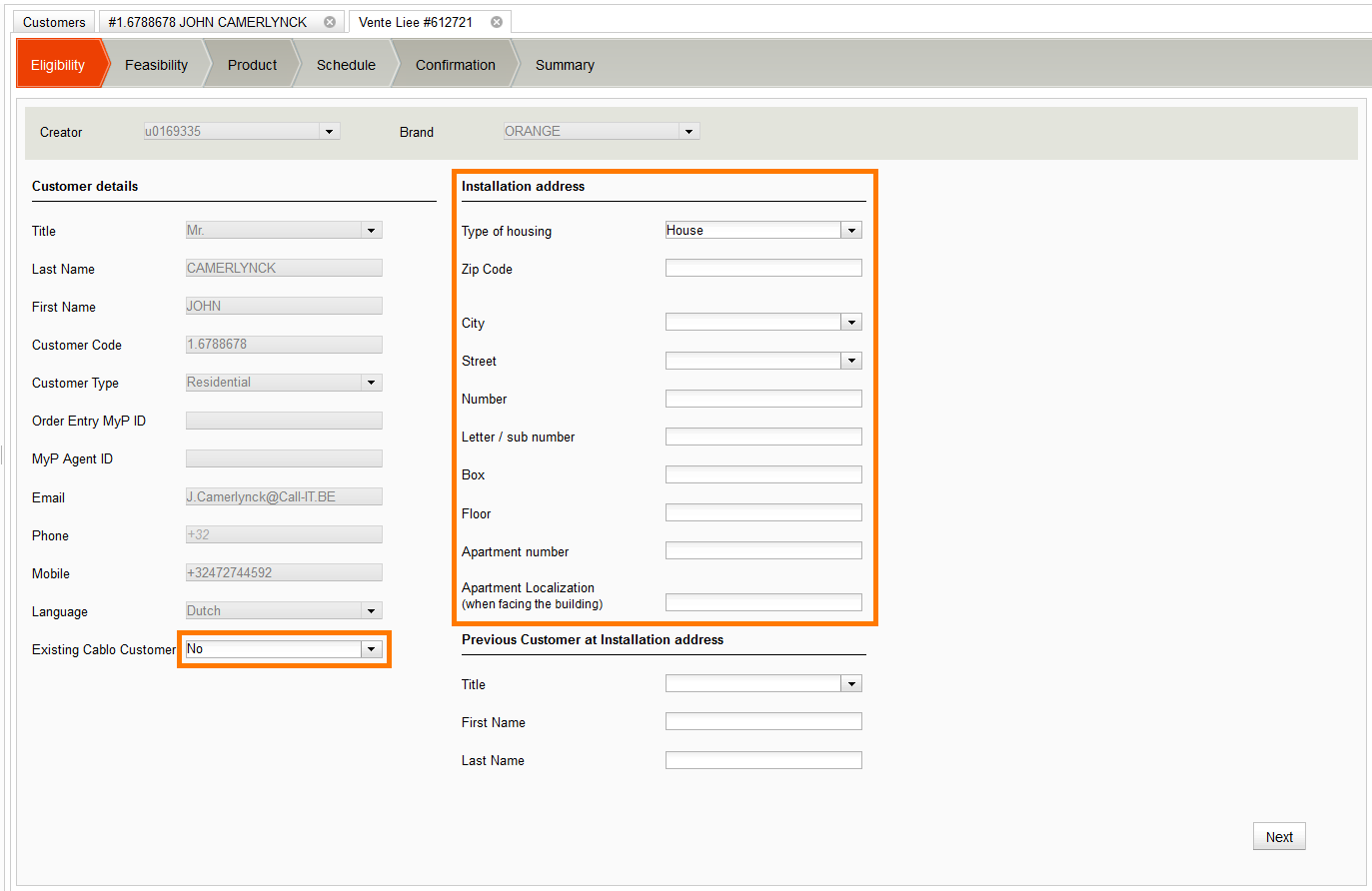 Bij een verhuis kan enkel het nieuwe adres worden ingevoerd. Het is daarom van belang om altijd eerst in Customer management de (contact)gegevens van de klant te controleren. Daarnaast moet Existing Cablo Customer altijd op No worden gezet.