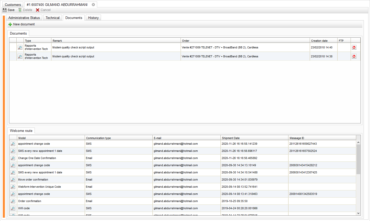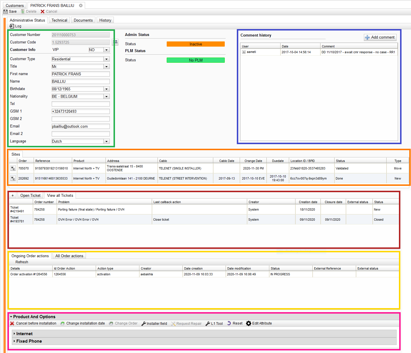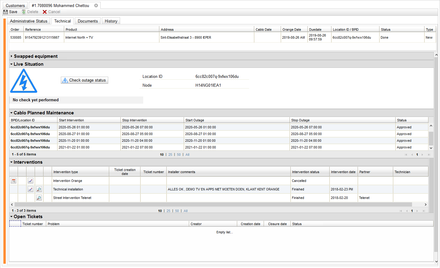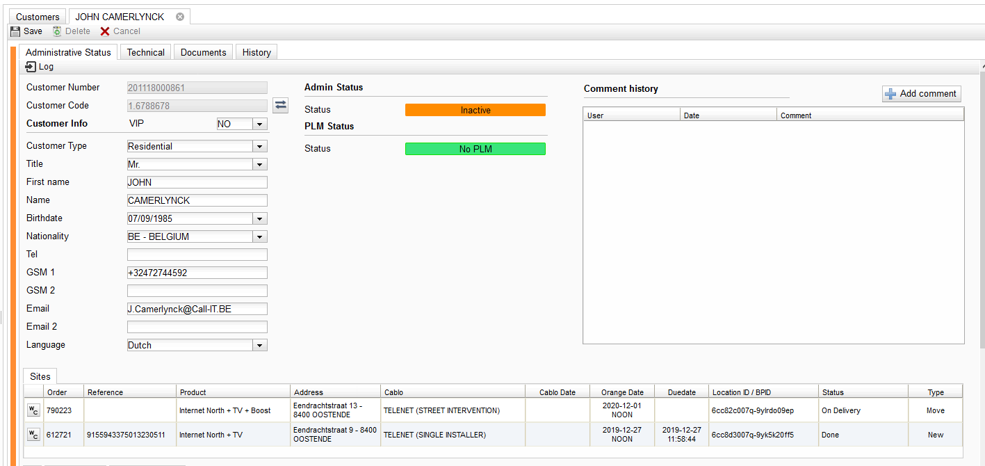 In Customer management kan een klant opgezocht worden en eens de juiste klant geopend is zijn er verschillende tabbladen met informatie. De klantinformatie opent standaard het Administrative Status tabblad, daarnaast is er ook nog het Technical tabblad, het Documents tabblad en het History tabblad.