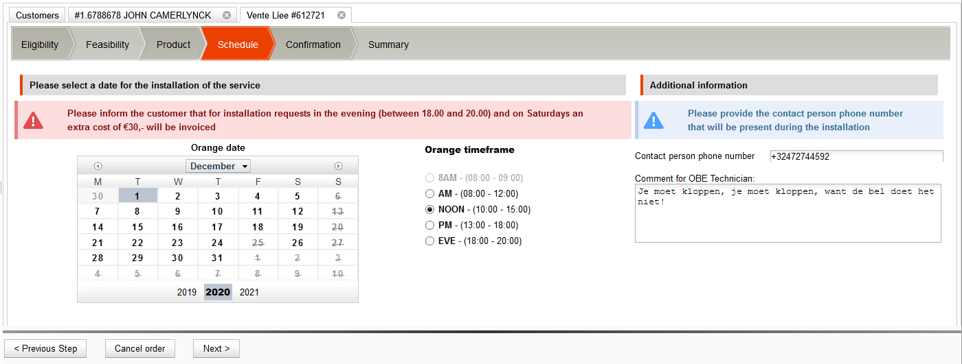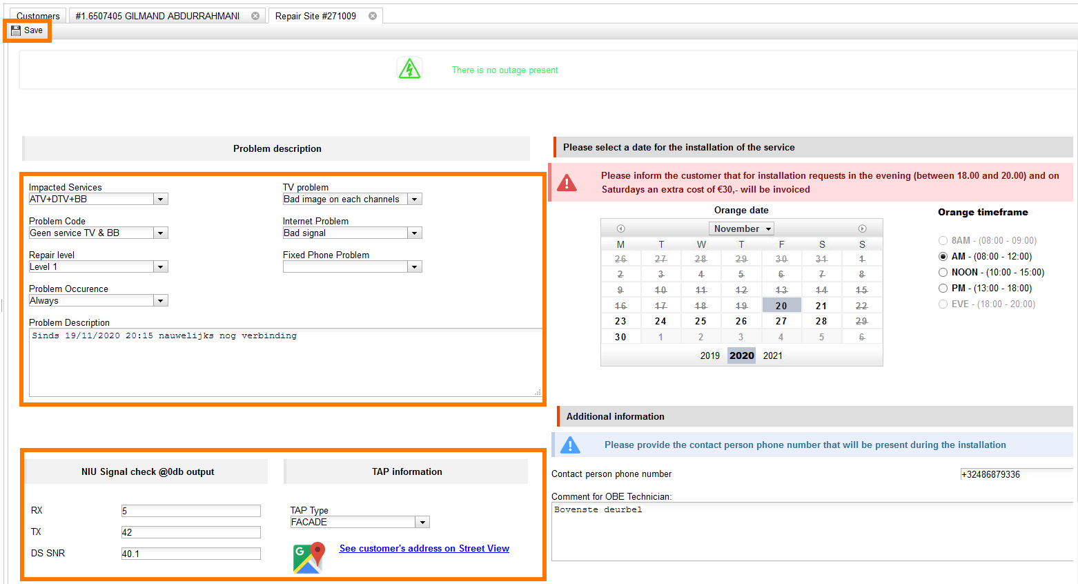 Als een klant technische problemen heeft doen we ons best te bepalen of dit een fout in het systeem aan de kant van Orange of de klant is en of dit vanop afstand opgelost kan worden met een reset of reboot. Als dat niet is geval is helpen we de klant om de technische installatie (kabels) te controleren. Wordt de oplossing niet gevonden en geeft het script aan om een technieker langs te sturen gaan we als volgt te werk: