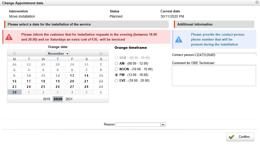 Reason: selecteer de juiste reden voor de wijziging van de afspraak.