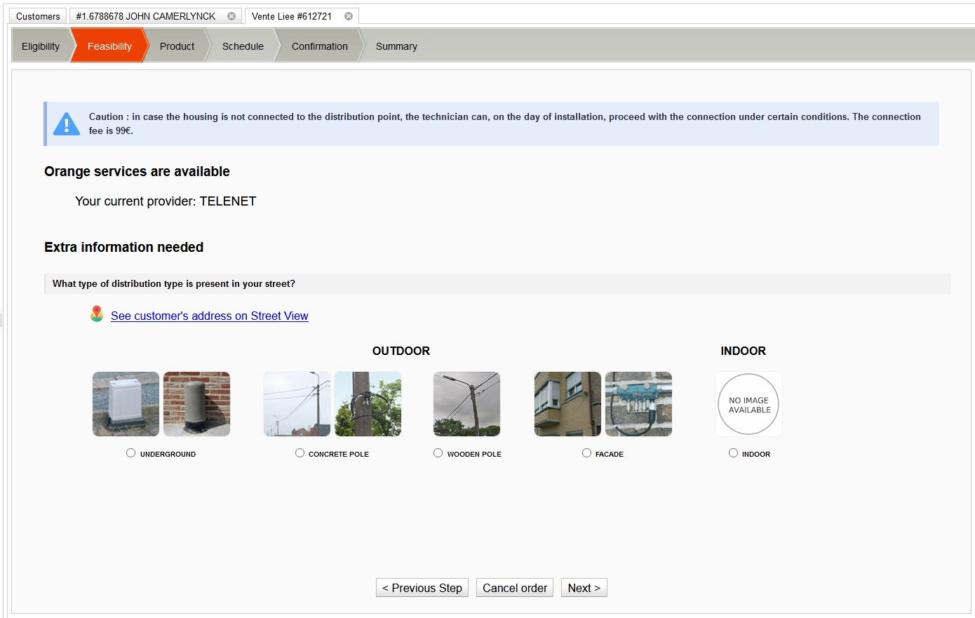 De volgende stap is het selecteren van het type kabelaansluiting in de straat bij de klant. Dit is belangrijk omdat de technieker in het geval van een betonnen paal of gevelaansluiting ervan op de hoogte wordt gebracht dat er een ladder meegenomen moet worden of in het geval van een houten paal er een hoogtewerker nodig is.
