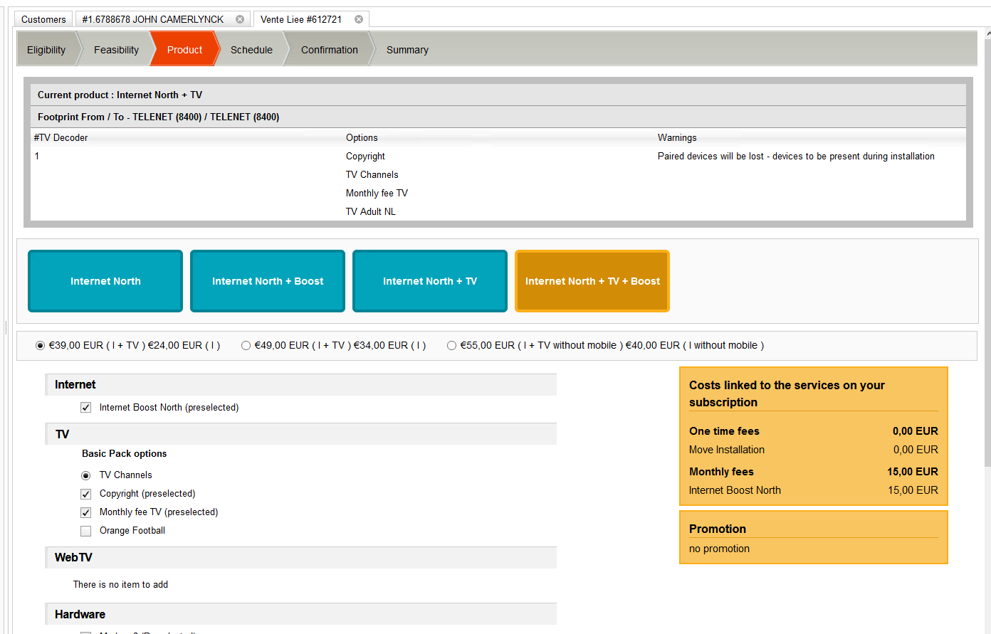 Nog steeds bij Products and Option selecteren we Move. Je komt nu in dezelfde procedure terecht als bij een afspraak inplannen voor een nieuwe installatie. Twee belangrijke aandachtspunten: