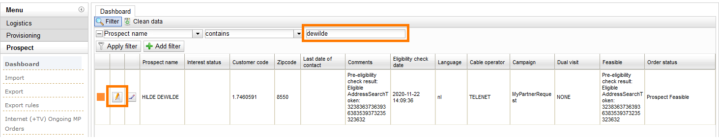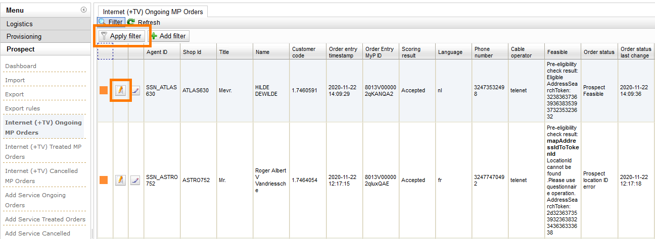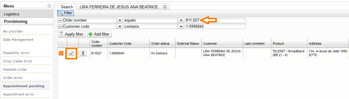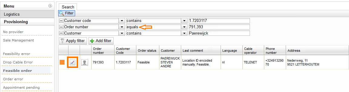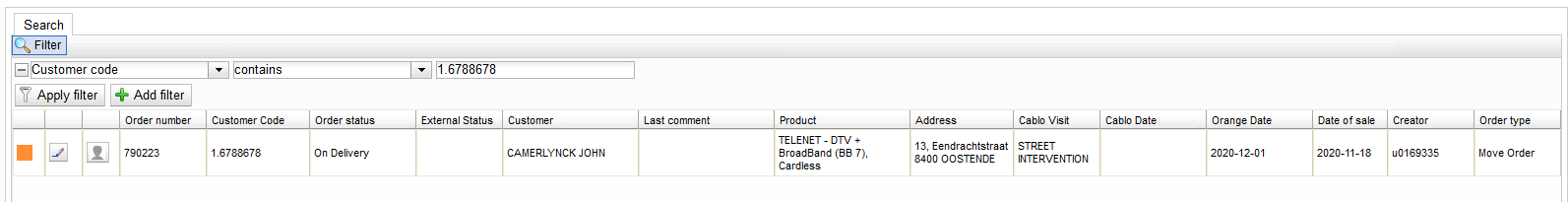 Na het ingeven van een order in Salesforce komen de orders direct hier terecht. Simpelweg op Apply filter filter klikken resulteert in een chronologische lijst met orders. Via Add filter is het mogelijk om te zoeken op bijvoorbeeld Name of op klantnummer (als die gekend is voor bijvoorbeeld een bestaande klant met gsm-abonnement).