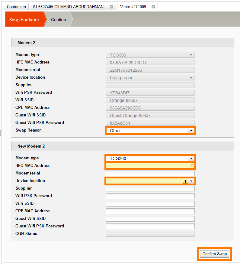 Vervolgens selecteer je of vul je de gegevens aan voor Swap Reason, Modem type, HFC MAC Address en Device location. De rest wordt automatisch aangevuld.